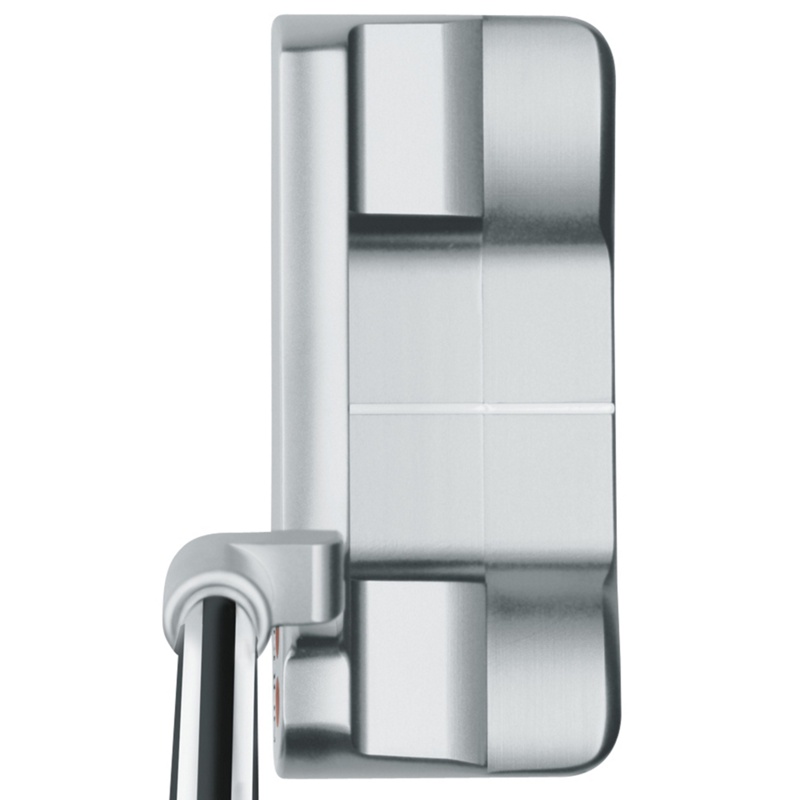 Toe sits higher than the heel to reduce the tendency to raise the toe at address which aims the putter left of the target.