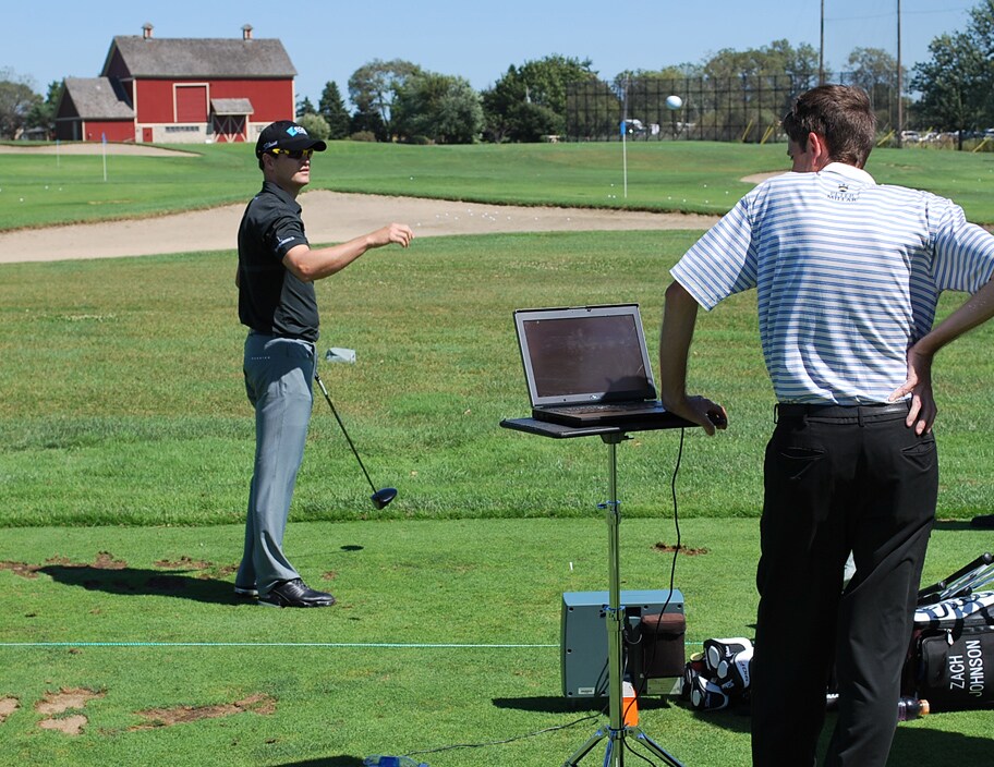 Titleist Tour Rep Fordie Pitts checks Zach's numbers on the TrackMan launch monitor.