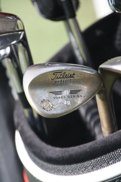 Riegger's bag features a Titleist 909D3 9.5 driver, new 910F 13.5 fairway metal and Vokey Design Spin Milled wedges (54, 60), stamped simply with "JR."
