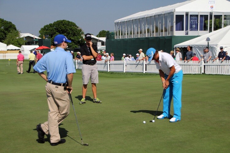 Titleist Brand Ambassador Rickie Fowler puts in some work on the putting green as Vokey Tour Rep Aaron Dill (left) looks on.