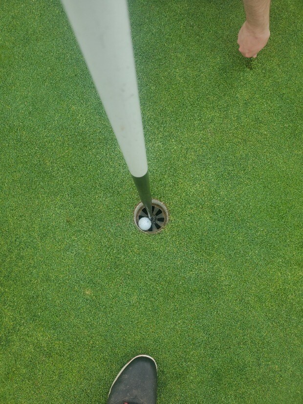 With three good.friends along side I used a 7 iron to hit a high fade to 13th Green. We all saw a nice bounce and ball track to the hole! Very exciting. Used my standard Pro V1x ball