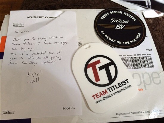 Iit is truly a good day!!!! Came home from working out and this was waiting at the front door. Bag tag, sticker & a hand written note... First class Titleist Thanks for making my day!!!!!!!