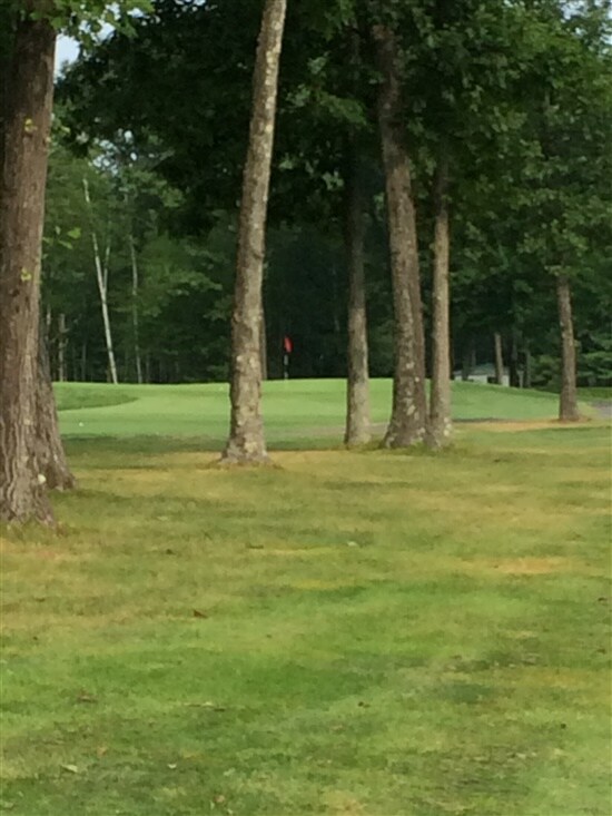 On the 9th hole, which happens to be my nemesis, I drove it right, right of the cart path, too close to the trees for a clear shot over them. Front pin (see red flag below). I took out my 8-iron, shut the face and hit a high hook up & around the trees. Landed it short, two bounces and clunk! Crazy!