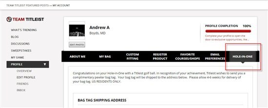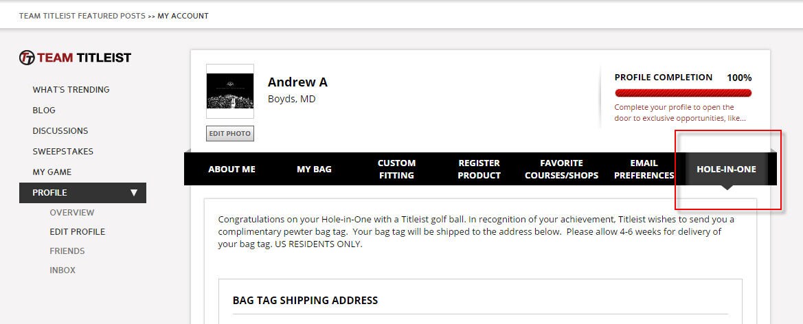 The Hole-in-One bag tag can be completed by editing your profile. Below is a screenshot on where this can be found.