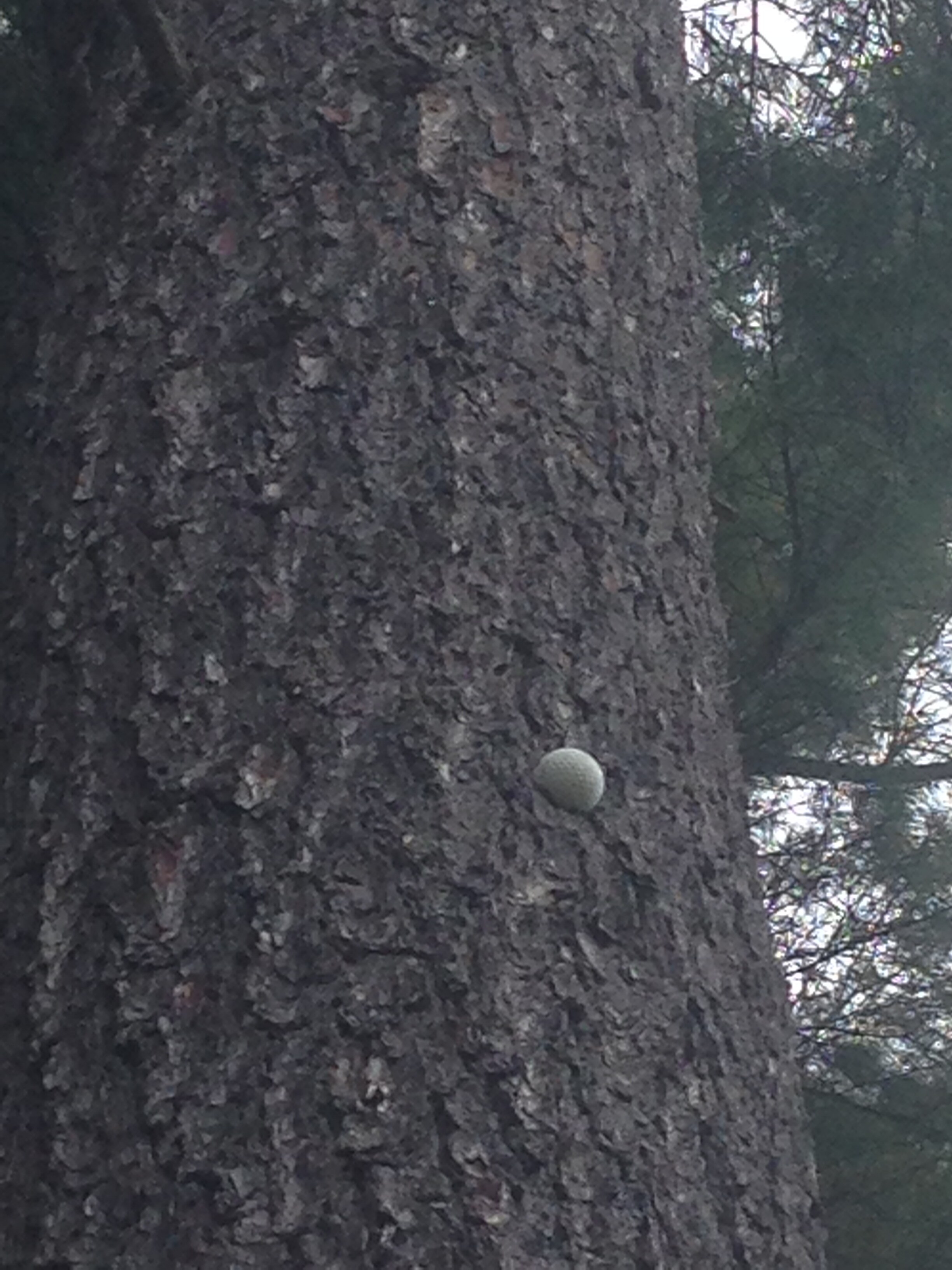 I've heard of balls getting stuck in branches or limbs, but never actually imbedded in a tree.